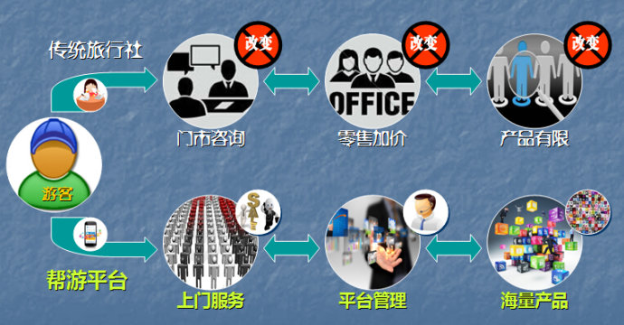 帮游 · 旅游新平台,不仅彻底改变了旅游OTA服务流程闭环不完整的弊端,也彻底改革了旅游行业旧形态,将对传统旅行社和传统电商都存在结构性改革的影响。