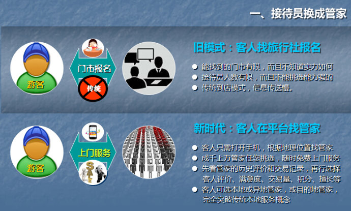 游客从找旅行社门市咨询报名,转变为足不出户直接在手机上挑选旅游专家免费上门服务;从无法选择自己的服务人员,转变为可以通过各项数据指标,有目的性地筛选甄别中意的服务人员;从只能在本地选择旅行社服务人员,转变为可以突破地域概念,在各大出发和目的地城市、甚至是全球选择服务人员。这极大地方便了旅游消费者。