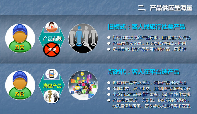 游客从在旅行社门市获取数量有限的跟团游产品,转变为可以在新平台上获取无限量的产品供应;从在旅行社获取大众产品为主流的普通产品,转变为可以获取主要以小众产品和定制产品为主的个性化产品。旅游碎片化需求可以在新平台上得以满足。