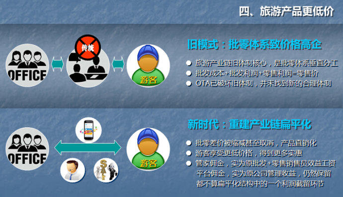 游客的旅游定制,从无法实现或价格奇贵,转变为真正实现和免费定制。旅游定制在老产业链里无法实现的真正原因是环节过多,批发商为了自身利益阻碍了旅游定制流程,或抬高了旅游定制客单价。当产业链在新平台上得以重建后,缩短的产业链让旅游定制能够真正落实,也降低了旅游定制的现实成本。