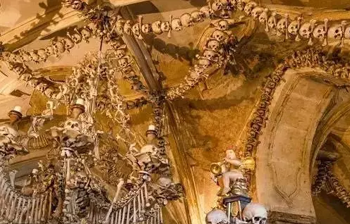 若你不是十分惧怕这些人骨,这里也不失为一个欣赏艺术的好地方。这些人骨被细致地用来砌成烛台、祭坛、圣杯、门楣、拱门、吊饰甚至十字架,教堂中那盏由人体各部分的骨骼造成的“人骨吊灯”更是值得一看。