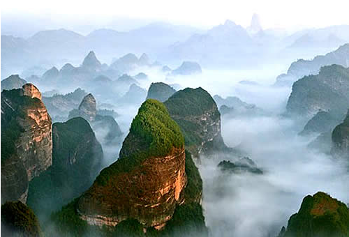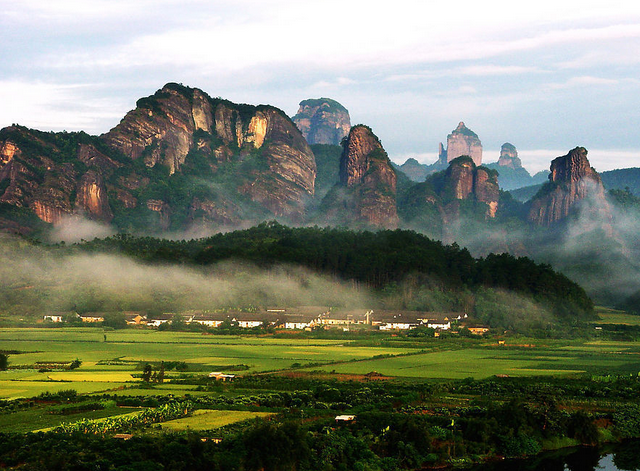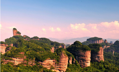 丹霞山位于广东韶关市东北郊,是世界"丹霞地貌"命名地。很多人以为丹霞山只是一座山,其实丹霞山是一片丹霞地貌的山区。狭义的丹霞山仅限于北部的长老峰、海螺峰和宝珠峰构成的山块。广义的丹霞山却包括了这里由红石组成的292平方公里的丹霞山区,即丹霞山风景名胜区。风景区位于南岭山脉南侧的一个山间盆地中,整体呈现一种红层峰林式结构,有680多座顶平、身陡、麓缓的红色砂砾岩,主峰巴寨海拔618米。整个风景区山石林立,错落有致,形象万千,宛如一方红宝石雕塑园,故又称"中国红石公园"。