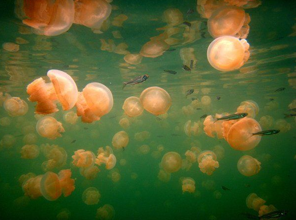 在帕劳,ta们是世界的独一无二。平静的水母湖面,一闪一闪地泛着金光,耀眼得很。潜入水中,游到湖中心就能看到这些能抱抱的几近透明的小生灵,大的用双手都无法将其合拢,小的几乎就像个水中升腾的气泡,你敢想象抱住一大朵水母的感觉吗?