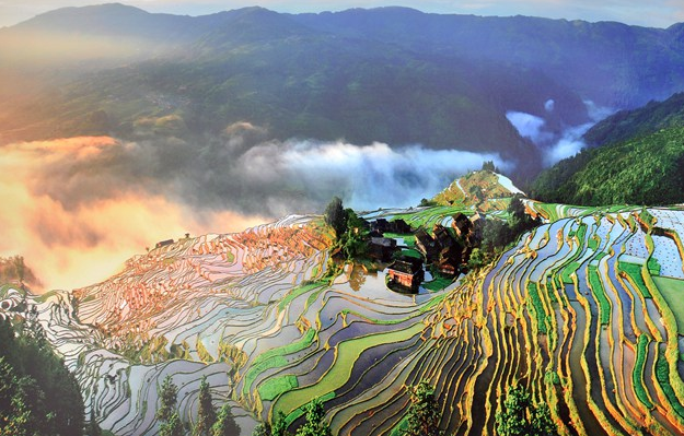每年的四、五月是贵州梯田注水的季节,注水后的梯田会闪现出银色的光芒,更凸显出其婀娜多姿的轮廓。夏天的梯田,是一片青葱稻浪,如一条条绿色彩带迎风飘扬。金秋的梯田,由于海拔不同,同处于一座山坡的梯田,黄色由浅变深,形态各异,共同组成了一幅幅精美的图画。冬季,梯田中夹杂着一些收割禾穗后的金色糯禾稻草和一些绿色的绿肥地,连同散落于田间宁静的吊脚楼,又构成了一幅幅美丽的中国山水画。