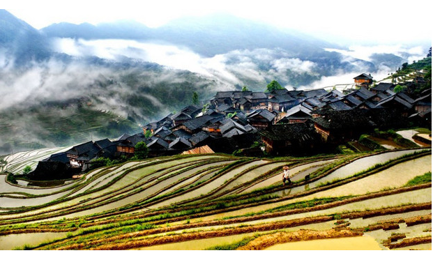 加榜梯田位于贵州省从江县加榜乡东北面,距县城80公里。加榜梯田规模宏大,气势磅礴,且线条优美。无论从局部还是整体形态来看,加榜梯田都吸取了天下梯田之精华,特别是那居于梯田间的山村、小寨与梯田朝相辉映,并与大自然融为一体,无不体现出人类与自然的和谐之美,给人一种“人间仙镜,世外桃园”的感觉。