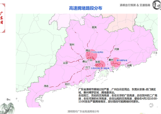 清明节广东高速有三大拥堵区域,分别是广州白云区周边、东莞长安镇-虎门镇区域、惠州博罗区域高速,在4月2日和4月4日拥堵最严重。