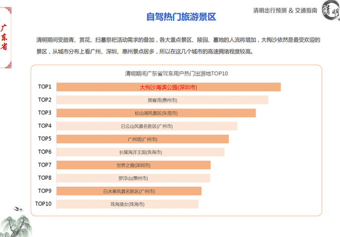 清明期间长隆、白云山、白水寨、广州塔、百万葵园等景点周边最为活跃易发生缓行或拥堵。