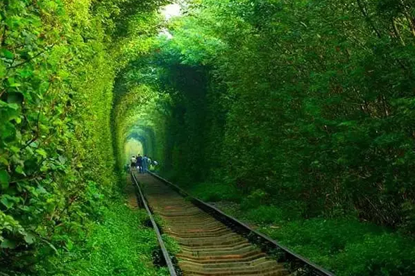 南京江宁有一段数百米铁路,铁路两旁绿树成荫,繁茂的枝蔓绿叶由于来往火车削磨,形成了浑然天成的绿色隧道。幽静的环境、美丽的景色,让它有了“爱情隧道”的美名。不少情侣,文艺青年慕名而来。