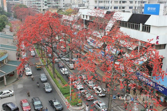 在不开花的季节里,江燕路一带的木棉树常常被人无视,甚至在炎炎夏日往往容易被人嫌弃——这么粗壮的树竟没有荫庇的用处。但开花的时候,鲜红艳丽的一片总是会让路人不觉停下匆忙的步伐,拍下一张张“艳照”。