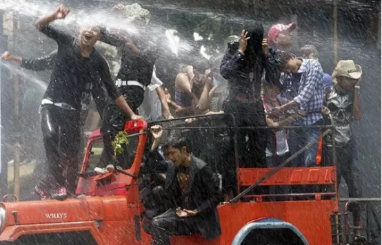 考山路是海外游客必去的地方。泼水节期间、附近商家大都停业,男女老少全体武装出动!上演湿身诱惑。游客和当地人一起加入泼水狂欢的行列,最夸张的是当地的消防车也会加入“泼水”活动,用水枪向人群洒水。