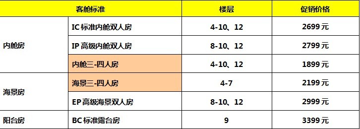 现在报名内舱房最低1899元,海景房最低2199元,标准露台房3399元,前一二位报名者还再让利500元。