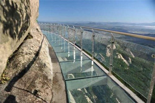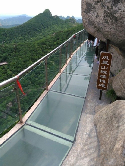 2. 辽宁丹东凤凰山玻璃栈道辽宁丹东凤凰山玻璃栈道位于景区海拔700多米处的「百步紧」和「天下绝」之间,依悬崖峭壁凌空而建。栈道全长102米,能同时承受50人游览。游客走在栈道上可以体验“凌空之感”的惊险。此栈道特别之处是尽头之处有一个宽8米,向外悬挑4米的玻璃观景台,能同时容纳20人观景。站在观景台上,就好像踏着空气一样,让人心生畏惧,却又想一步步地向前走,看更壮观的大自然景色,大大提高栈道的刺激性。