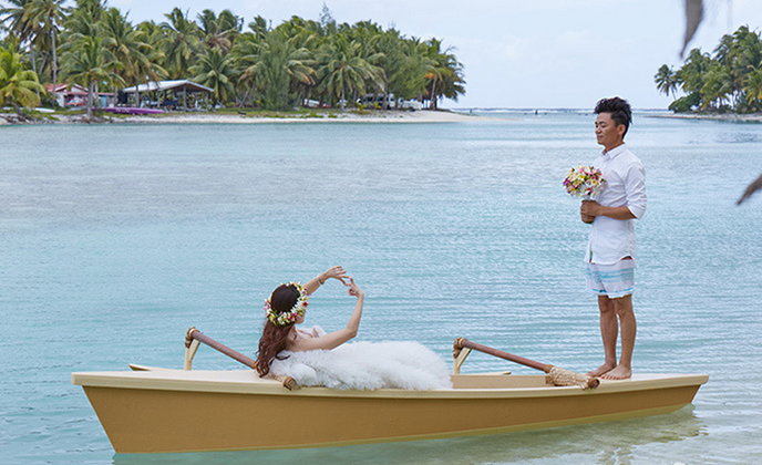 他们的婚纱拍摄地是在南太平洋库克群岛上,这个与世隔绝的库克群岛风景十分美丽,去的人却极少,而且对中国人免签。