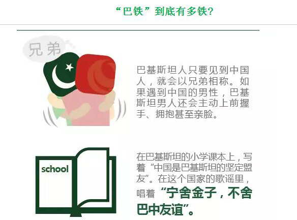 巴基斯坦人只要见到中国人,就会以兄弟相称。如果遇到中国的男性,巴基斯坦男人还会主动上前握手、拥抱甚至亲脸。伊斯兰堡有很多安检,一看到中国人就会直接放行,不需要安检。