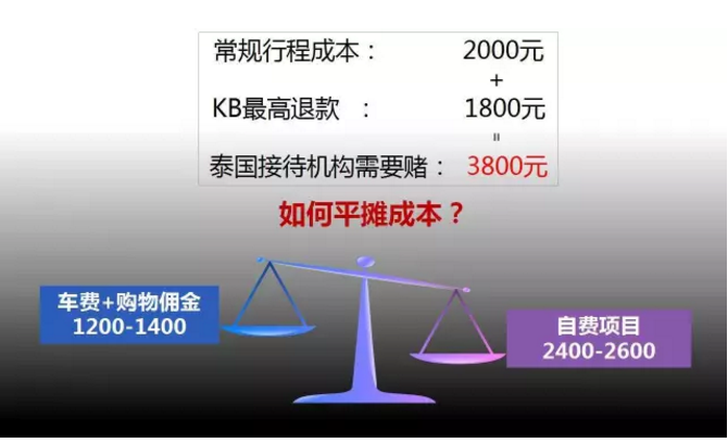 假设中国游客在泰国常规行程的成本是2000元人民币,近几年KB最高时达到退款1800元人民币。也就是说,泰国接待机构需要赌3800元人民币。
